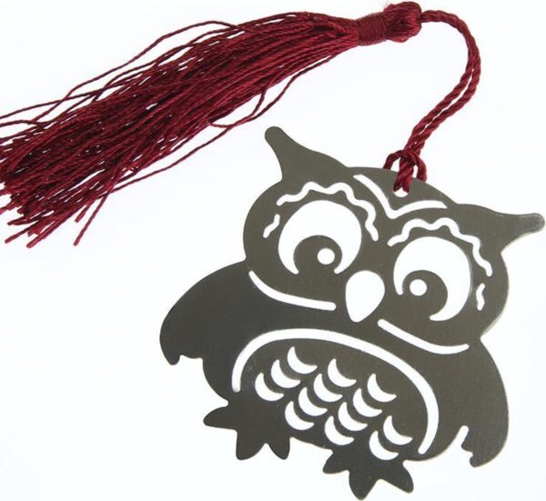 Een prachtige boekenlegger in de vorm van een uil, uitgestanst uit zilverkleurig metaal. De bladwijzer is zeer gedetailleerd gemaakt en mooi afgewerkt. Aan de boekenlegger zit een wit kwastje, waardoor nog makkelijker te zien is waar je bent gebleven met lezen. De metalen uil is ongeveer 7.5 x 6.5 cm