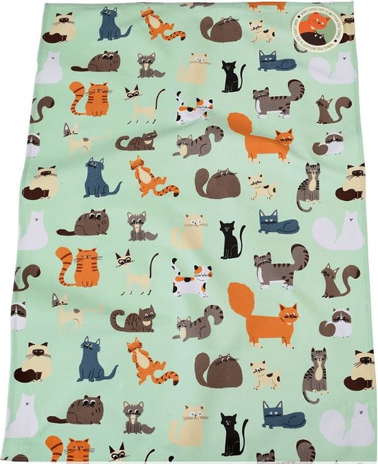 Mooie groene katoenen theedoek met katten verschillende katten.