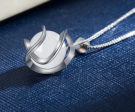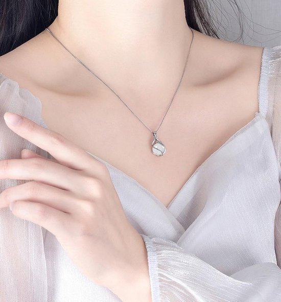 Sierlijke verzilverde hanger met hierin een maansteen verwerkt. Deze ketting wordt geleverd in een sieradendoosje, dus ook leuk om weg te geven.