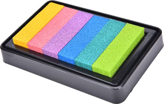 Stempelkussen op oliebasis met 6 verschillende kleuren om verlopend of apart te gebruiken. De verschillende kleuren stempelkussens zijn 1.3 x 4.5 cm