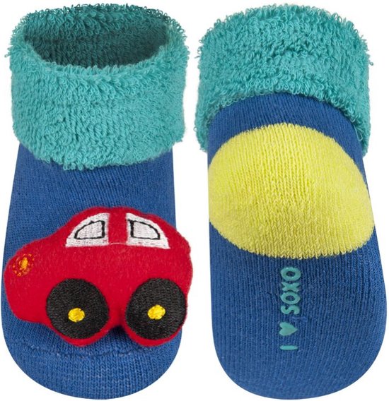 Warme badstof sokjes met antislip. Op de teen een auto met een rammeltje er in.