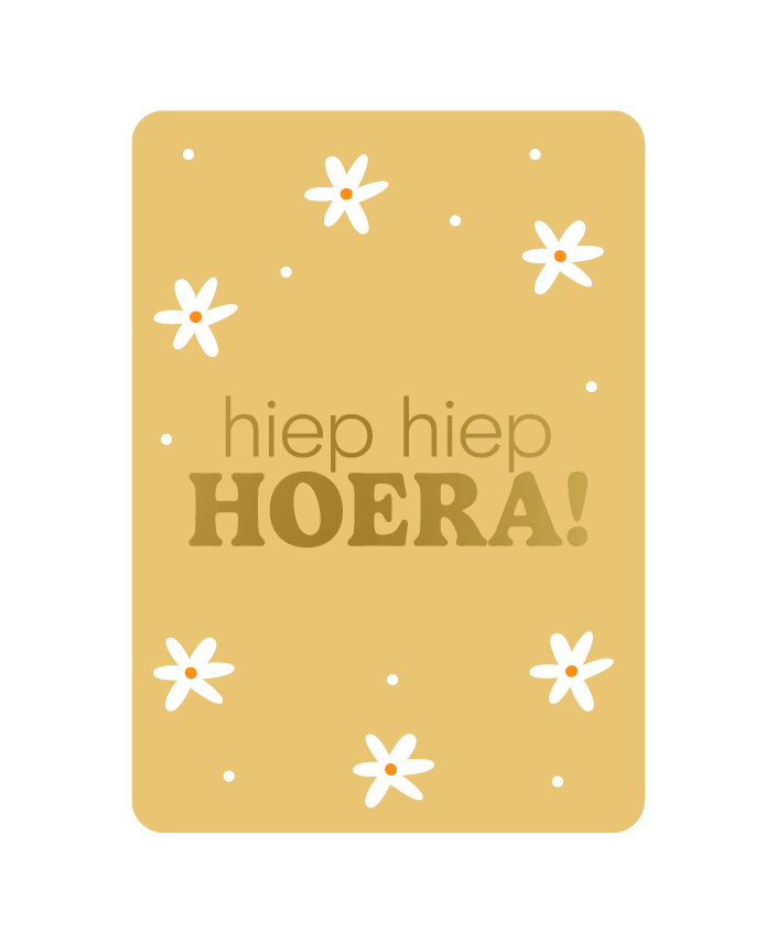 Mooie wenskaart van stevige kwaliteit. Op de voorkant staat de tekst ‘hiep hiep HOERA!’ van goudfolie. Op de achterkant staat alleen klein de merknaam vermeld. Er is dus genoeg ruimte om te schrijven.