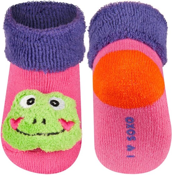 Warme badstof sokjes met antislip. Op de teen een kikker met een rammeltje er in.
