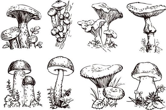 Verschillende clear stempels met paddestoelen, kunnen eventueel gebruikt worden in combinatie met een acrylblok.