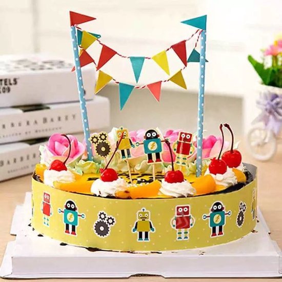 Maak je gebak extra feestelijk met deze set cocktailprikkers, vlaggetjes en de strook die om de rand van de taart gewikkeld kan worden.
