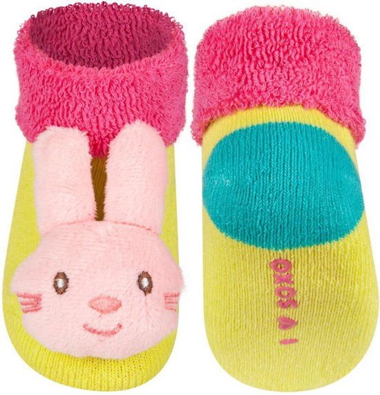 Warme badstof sokjes met antislip. Op de teen een konijnenkopje met een rammeltje er in.